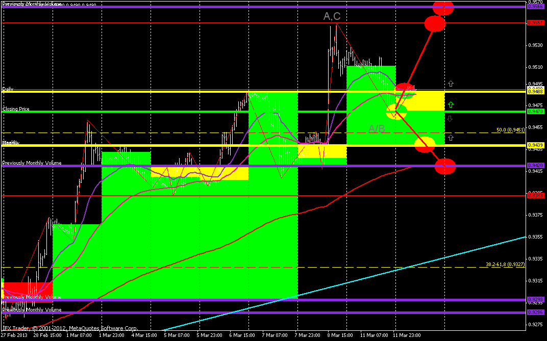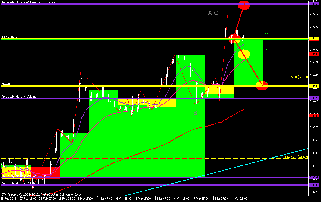 Исходя из технического и фундаментального анализов, пара находится в близи прогнозируемого вчера уровня снижения 0,9480. И вероятней всего уровень будет достигнут уже в ближайшее время. Пара продолжает движение в восходящем тренде, формируя нисходящую волну. Если судить по тренду то снижение может продолжиться вплоть до 0,94 фигуры. Однако индикаторы указывают что в ближайшее время рост возобновится. И поэтому я ожидаю снижения пары до 0,9450, после чего возобновление роста.