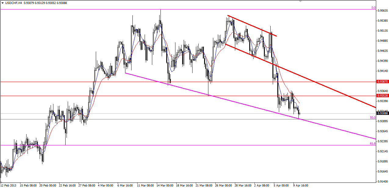 Сегодня пара двинулась еще ниже и добралась до диагональной поддержки. Сейчас цена так же находится на поддержке, отметке 50-процентной коррекции от уровня 0.9022. Краткосрочное сопротивление на 4н находится на уровне .9352. Поэтому между этими уровнями возможно будет боковое движение. |