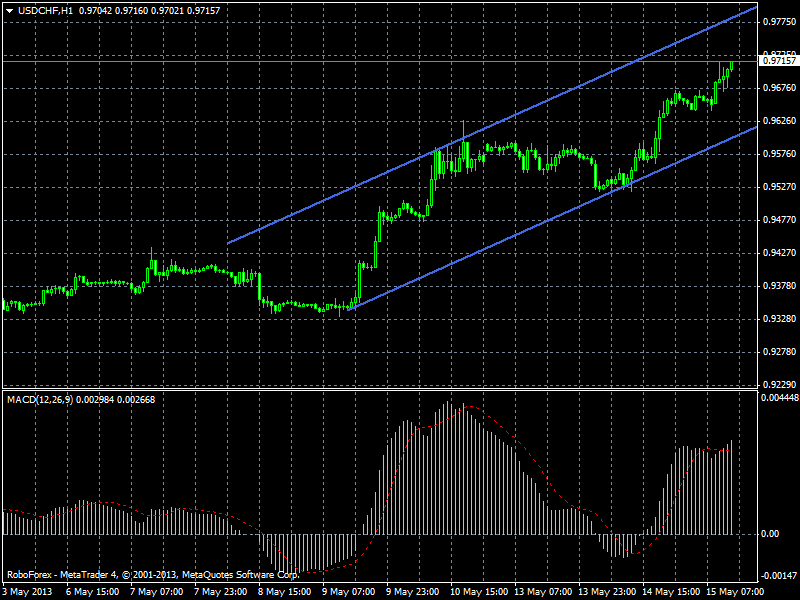Валютная пара движется в рамках восходящего канала на часовом графике. На данный момент цена находится в середине канала и продолжает свой рост. По паре планирую покупки с целью до уровня сопротивления канала 0,9780. На продолжение восходящего движения указывает растущая гистограмма MACD. Прикрепленные файлы: