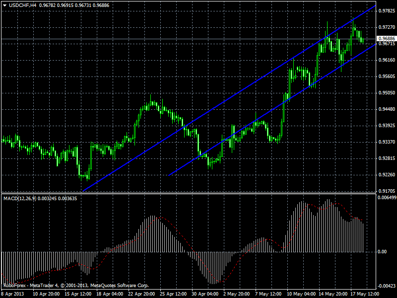 Пара вошла в уверенный восходящий тренд, и сейчас движется к линии его поддержки, пока ничего не указывает на смену тренда, индикаторы так же смотрят вверх, макд подал сигнал на покупку, и поэтому я рассматриваю дальнейший рост пары вплоть до 0,9850 как наиболее вероятным, стплост следовало бы выставить ниже линии сопротивления в районе 0,9660