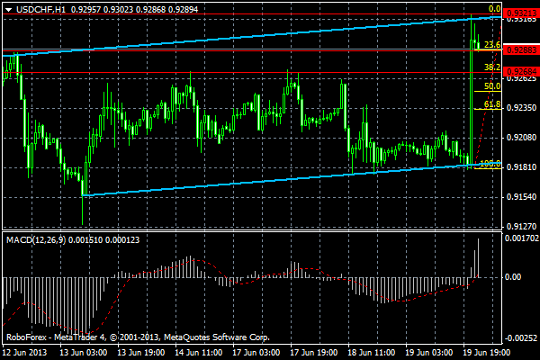 Доброго времени суток. Как видим на часовом графике была пробита фигура симетричный треугольник. На данный момент цена тестирует пробитую линию, рекомендую открыть ордер на покупку с целью роста валютной пары к уровню 0.9270. МАКД находится в положительной зоне что подтверждает рост пары. Побольше профитных сделок! ![]() Редактировалось: 1 раз (Последний: 18 июня 2013 в 00:57) | ||||