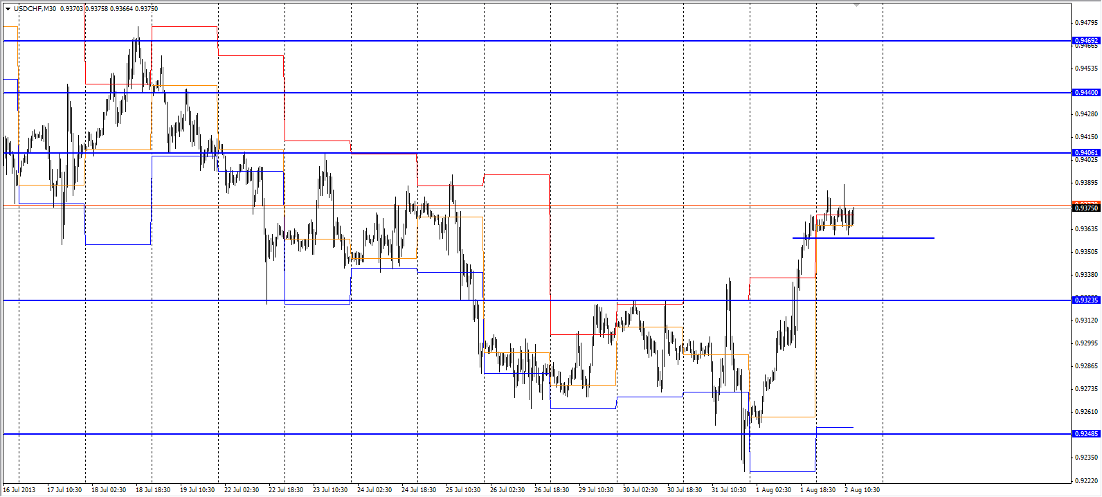 На данный момент по паре USD\CHF торговля ведется выше скользящих средних линий. дополнительный индикатор выше нулевой линии с показанием на понижении а основной индикатор на третьем баре дает сигнал на продажу , рекомендую продать при пробитии линии 0.9357 до линии поддержки 0.9333 стоп лосс установить у линии сопротивления 0.9368.