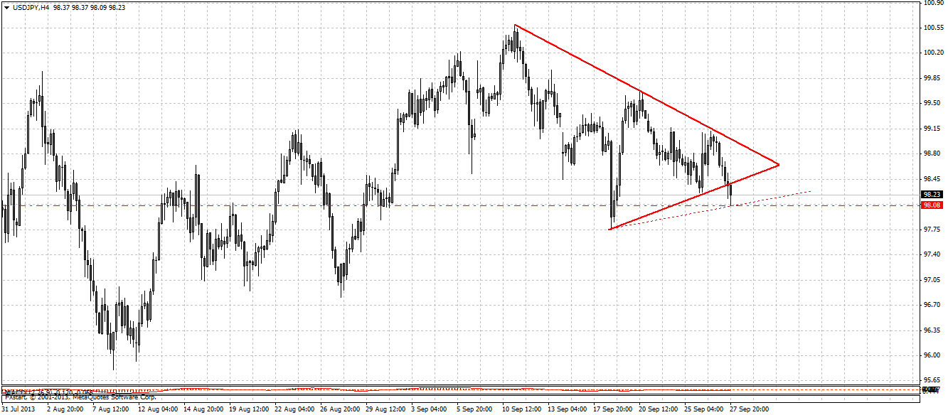 По USD/JPY на Н4 сформировалась фигура "треугольник". Как видно из рисунка, цена пробила нижнюю границу треугольника, сформировав сигнал на продажу. Открывать ордер планирую на ретесте минимума последней свечи - 98.08. Если цена двинет вверх, то буду рассматривать тот же тругольник, только нижнюю границу перенесу на уровень показаный пунктирной линией. Прикрепленные файлы: