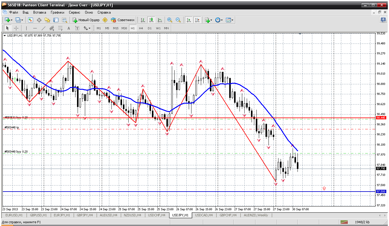 Пара доллар иена открылась с гепом через минимум прошлой недели 98,08 .Пока в торговле рассматриваю сигналы на продажу при торговле ниже уровня и сигналы на покупку при закрытии гепа и торговле выше 98,08 . Прикрепленные файлы: