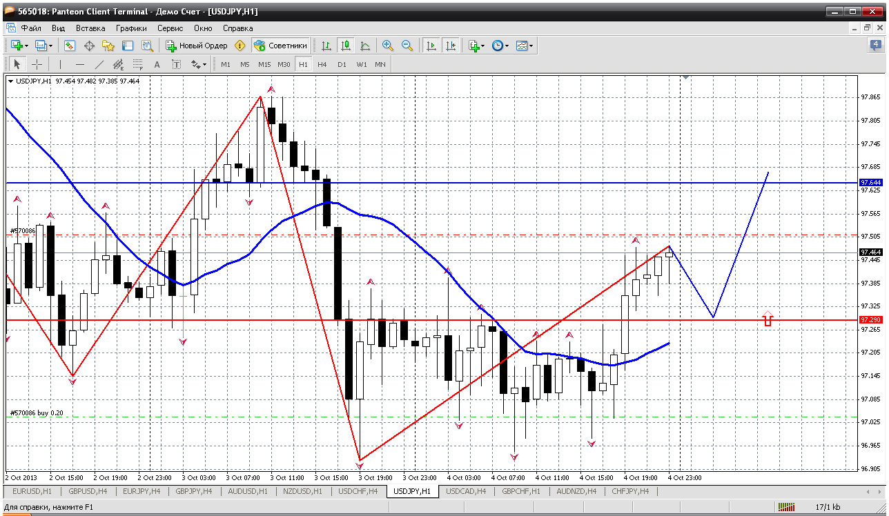 Как видно пара по прежнему находится под сильным давлениям медведей которые сосредоточились в районе скользящих аллигатора, рассматриваю 2 сценария развития :первый- продолжения южного тренда и прорыв 3 нижних фракталов (район 97.00 фигуры)- это приведет к продолжению южного тренду, Второй- укрепления выше 97.35 должен открыть 98.00. ![]() | ||||