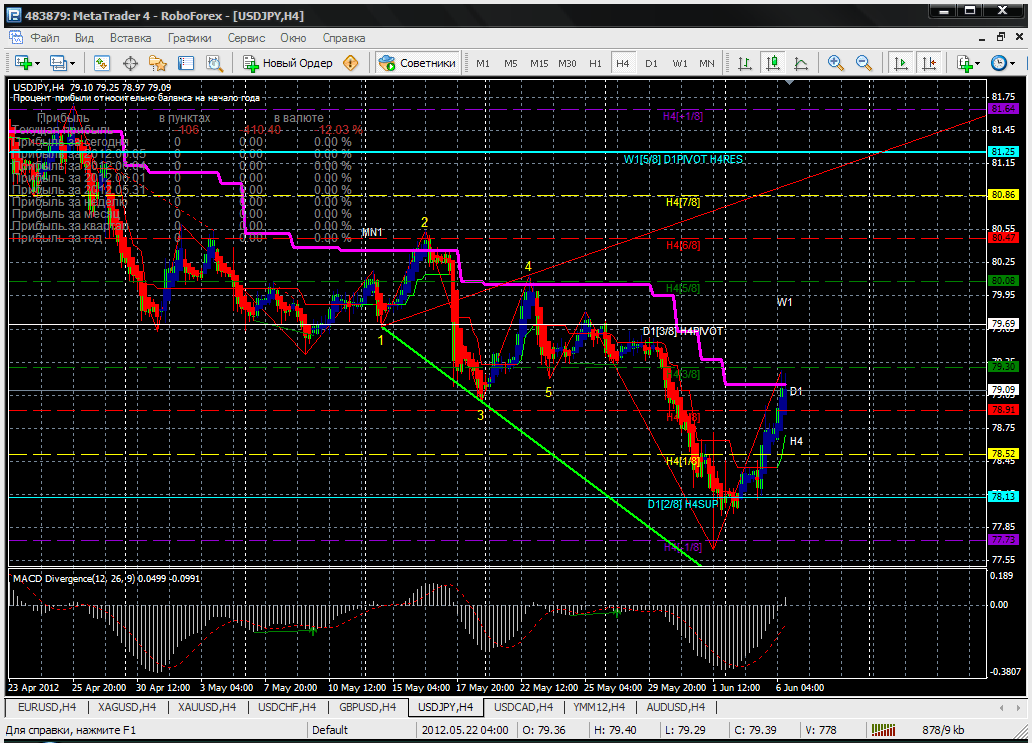 по японцу как и предполагалось - начался рост пары. при прохождении уровня h4 (3/8) - 79.30.ожидаю дальнейшее повышение пары к уровню -80,08 h4 (5/8).индикатор macd направлен в положительную зону. Прикрепленные файлы: