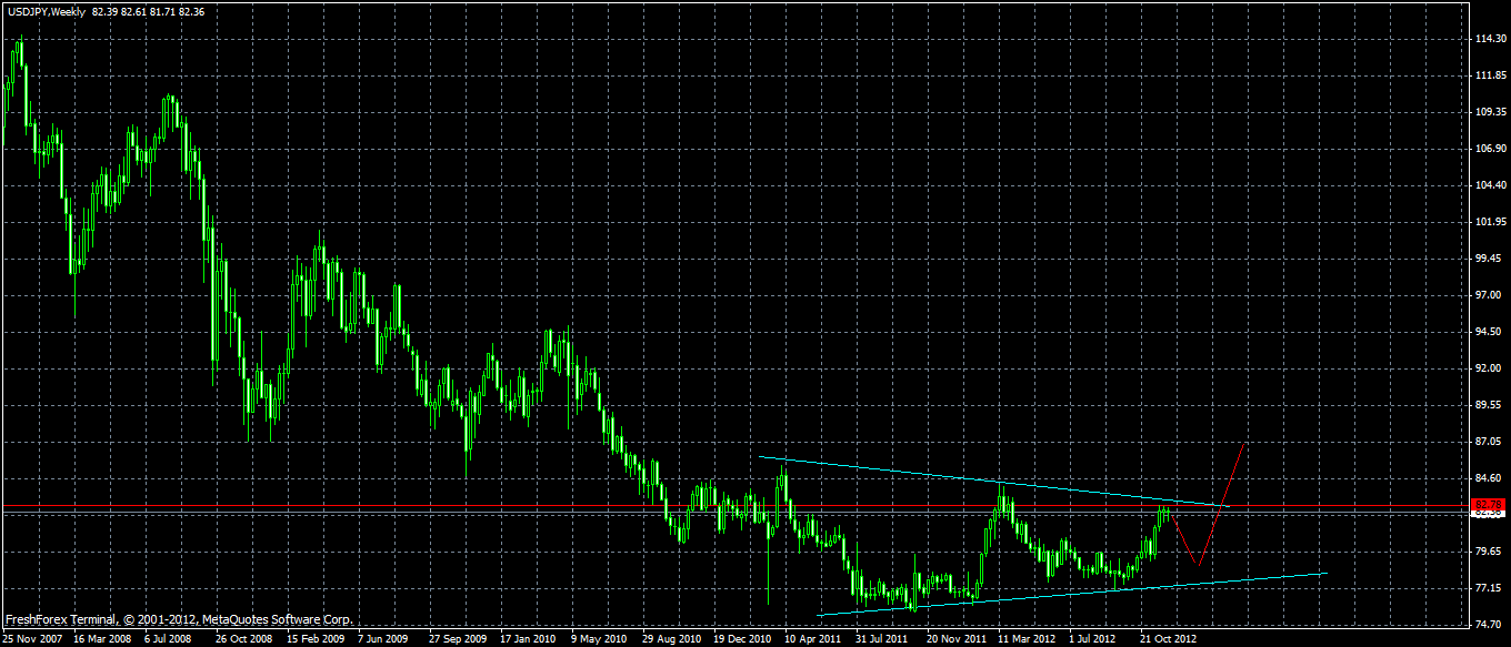 Для USD\Jpy сопротивление на 82.76 стало значительным припятствием.Я так же расматриваю продажи из этой области .тем более на недельном тайм фрейме виден треугольник для которого необходима еще одна волна вниз Единственный способ поумнеть это играть с более умным противником. |