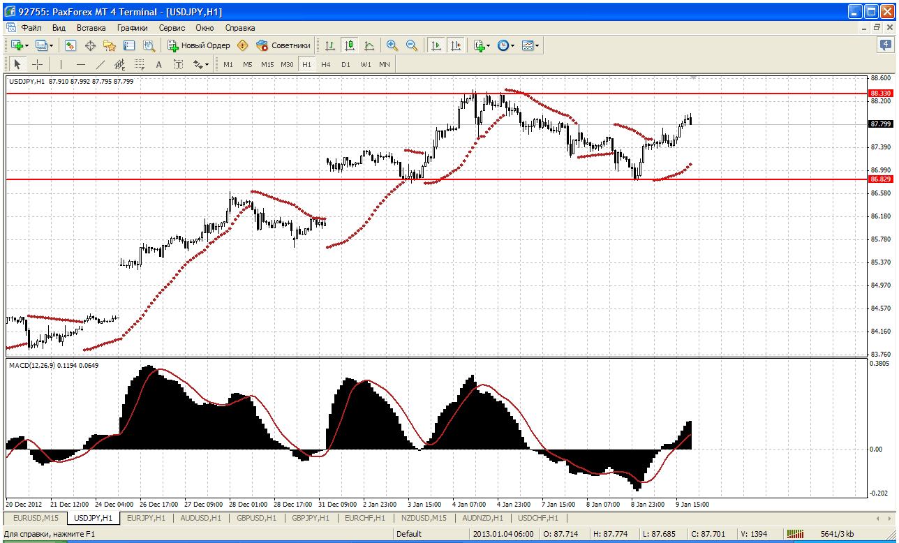 Пара продолжает коррекцию в районе 86,80-88,30. Однако МАСД расположен выше 0, и параболик находиться под ценой, что указывает на тестирование района в области 88,30. В случае прорыва ждем пару на 89. Прикрепленные файлы:
