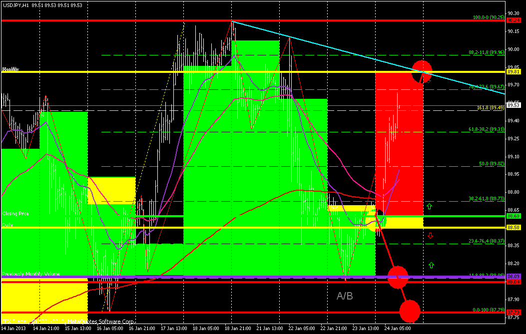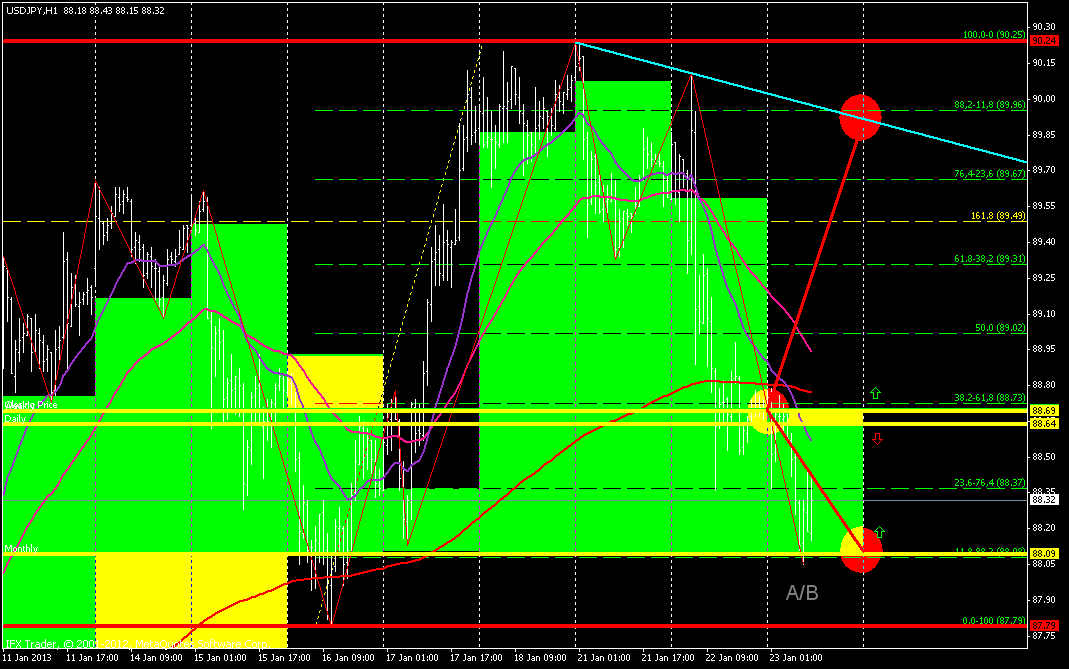 на моём графике пара торгуется в боковом канале или диапазоне между котировками 88,00 - 90,00. Данный откат соответствует 23% откату по Фибоначчи. Если котировки пары дллар/йена пробьют поддержку, то следует ожидать дальнейшее движение пары вниз.