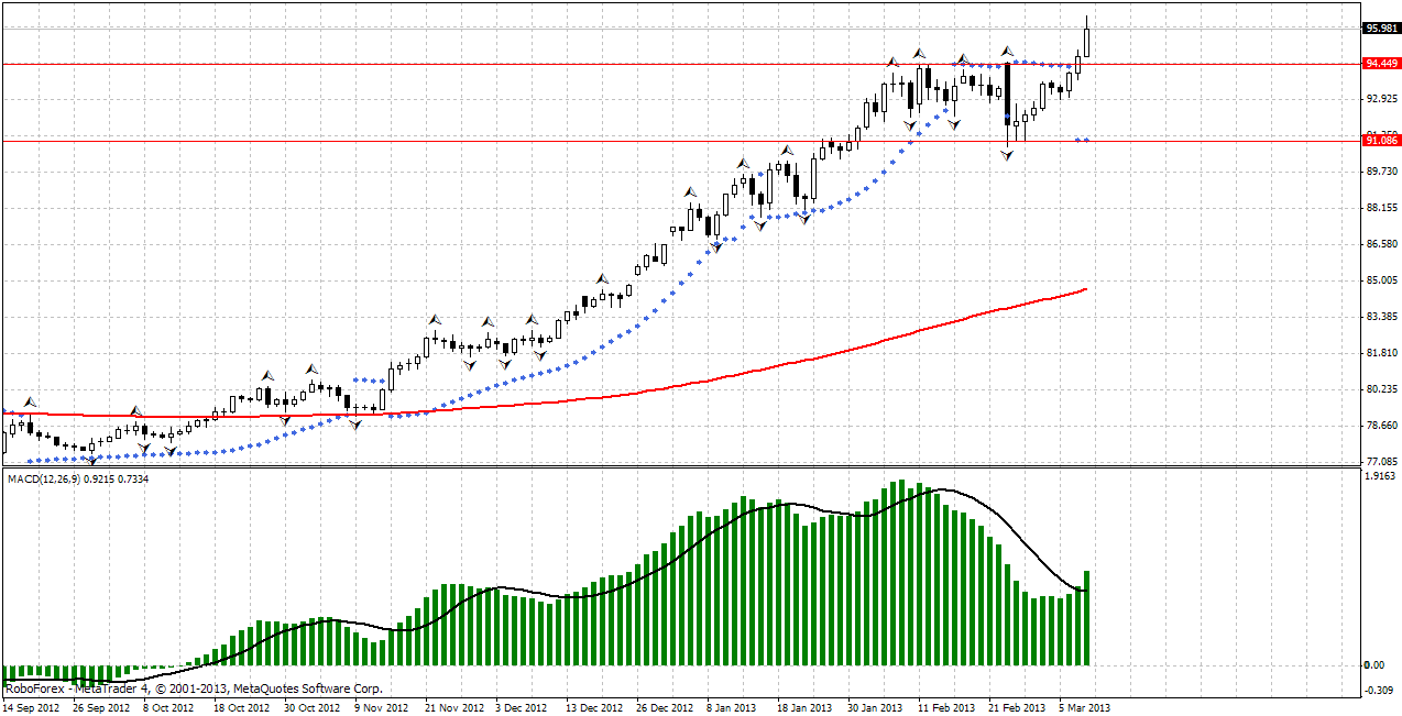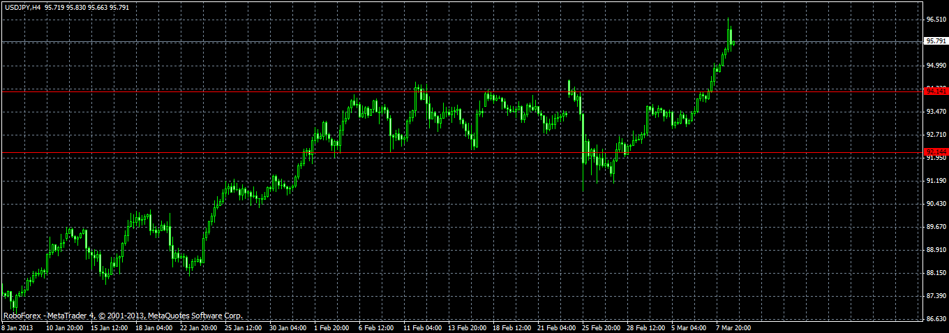 Мой аналитический прогноз по валютно паре USD/JPY на следующую неделю с 11.03.2013 по 15.03.2013 Валютная пара доллар иена продолжает развивать восходящий тренд. Уровень 95 достигнут и перекрыт. На следующей недели так ка цена слишком завышена рассматриваю возможность коррекции на снижении на первый тест уровня 95.70 и далее развитие структуры роста на исполнение цели с перекрытием 96.53 97.00 и возможно выше. ![]() | ||||