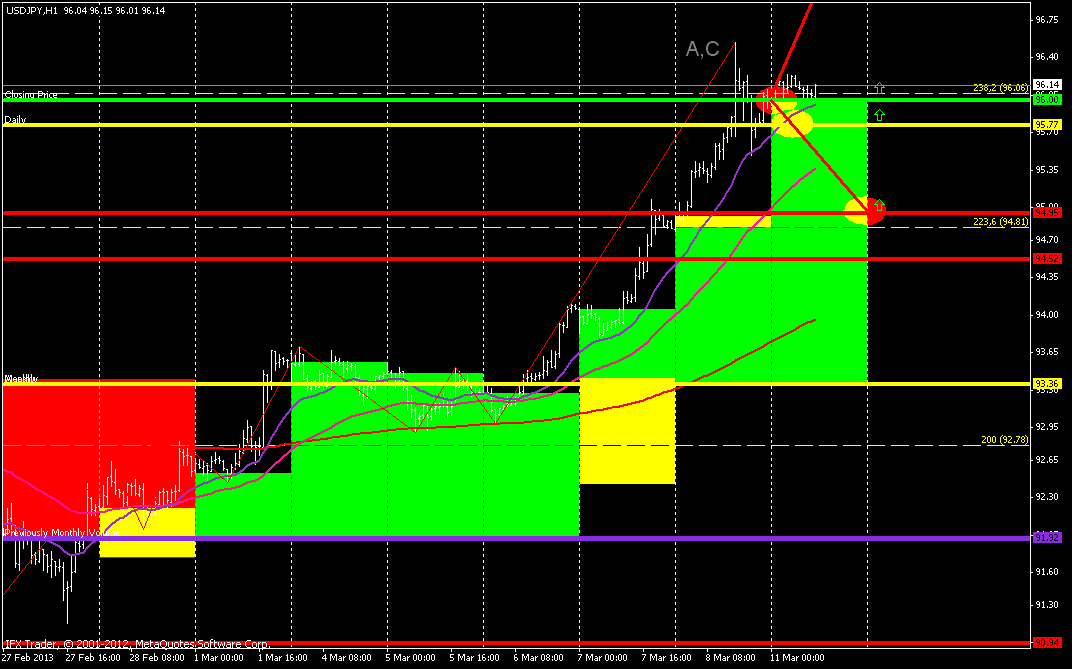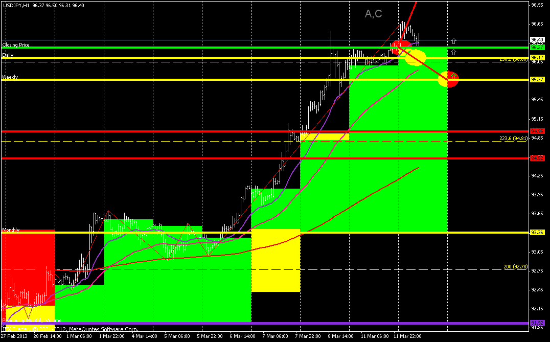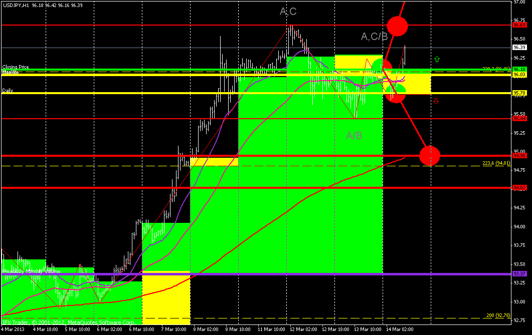 ![]() На данный момент на паре штиль. А штиль довольно нередко заканчивается резким и быстрым прорывом с последующим ростом либо падением. Так что могу в данной ситуации держать отложенные ордера на бай от 96.50 и на селл от 95.70. Что касается выбора тейк профитов, то советую не жадничать и больше 100 пунктов не ставить. | ||||