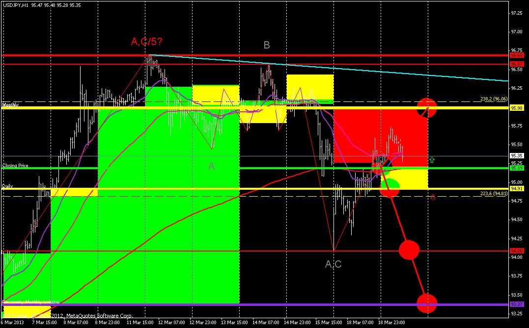 Приветствую вас уважаемые трейдеры! Прогноз на среду 20 марта по валютной паре USD/JPY таков,валютная пара доллар иена отработала пока только две волны снижения пробив 95.10(0.0%уровень фибоначи) На завтра можно планировать развитие ещё одного импульса снижения на обновление вчерашних минимумов 94.32. Далее следует рассматривать ещё одно развитие очередной волны роста на пробой перекрытие ценового уровня 95.73 ![]() | ||||