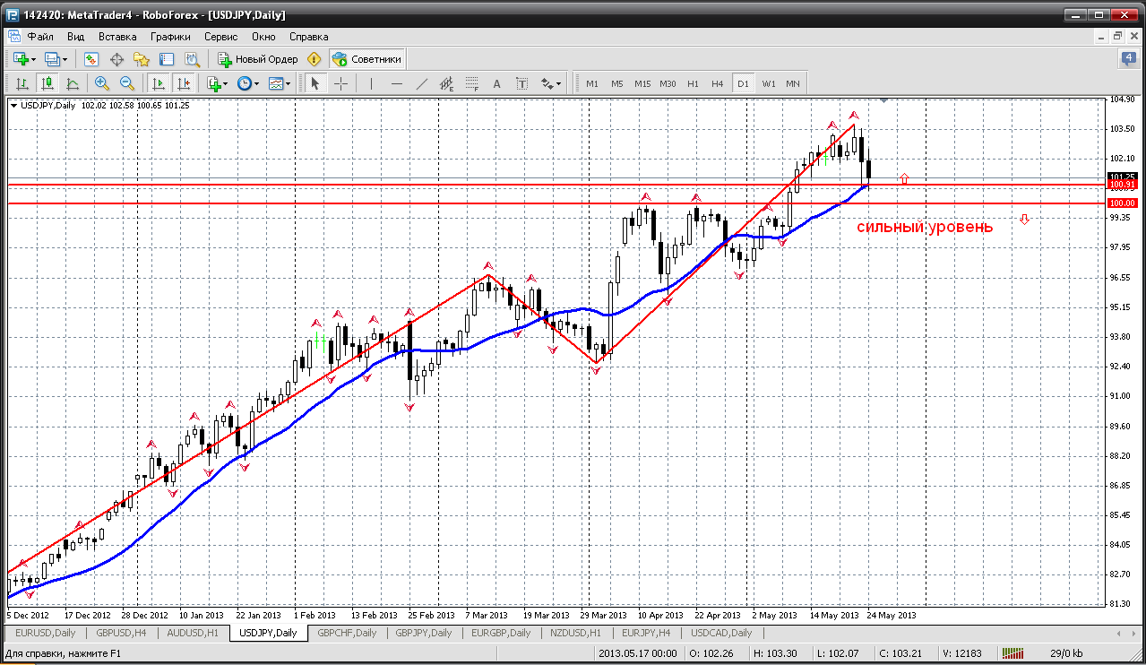 Долларйена....пока отскакивает от мувинга (18) на дневном графике, сейчас это цена 100.91, далее ниже уровень 100 очень серьезный. И пока не закрепимся ниже, о серьезных и длительных продажах говорить не стоит. Но и обновление хаев тоже не жду. Так и будем между уровнями 100 (снизу) и 103.73 (сверху) ходить. Вряд ли летом найдутся силы, которые захотят вывести цену из этого диапазона. Прикрепленные файлы: