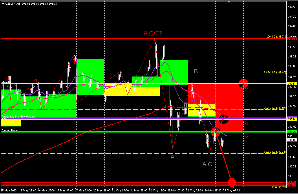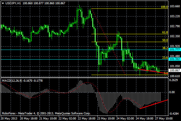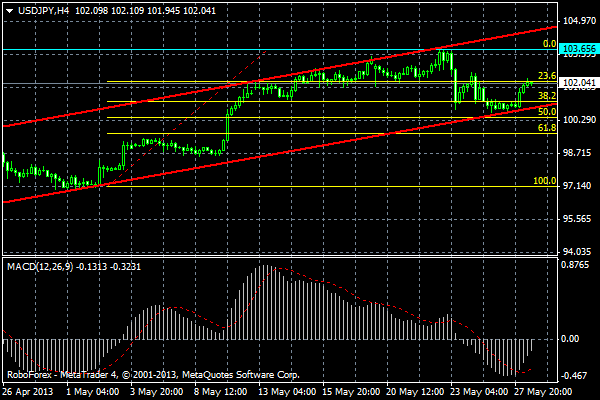 В моём прогнозе на следующую неделю с 27.05.2013 по 31.05.2013 по валютной паре USD/JPY Исходя из технического и компьютерного анализа. Валютная пара доллар иена двигается по прежнему в восходящем тренде и находится у своих годовых максимумов! Индикатор осцилятор стохастик указывает на рост,на след.недели рассматриваю на графике Н4 возобновление роста пары,к ценовым уровням 102.15(0.0%уровень фибоначи) и 103.64 далее рассматриваю отскок пары от лини сопротивления к уровням 101.83 и 99.31(20.0%уровень фибоначи) ![]() | ||||