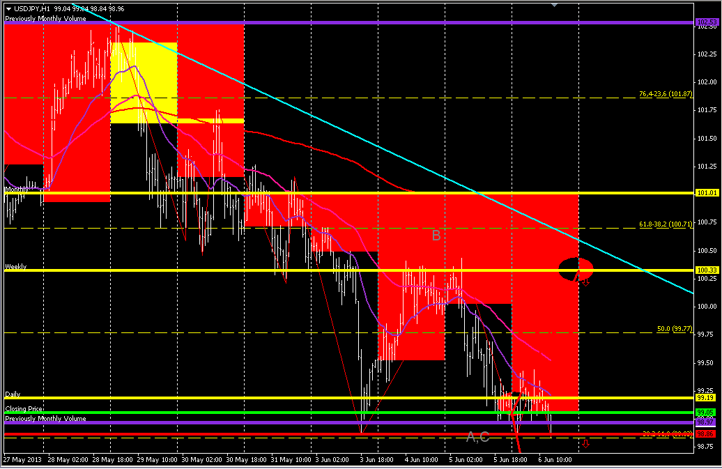 Прогноз USD/JPY на 7 июня 2013г.: ![]() Пара находится в медвежем тренде, но ожидается коррекция и она должна подняться в район 98.98. | ||||