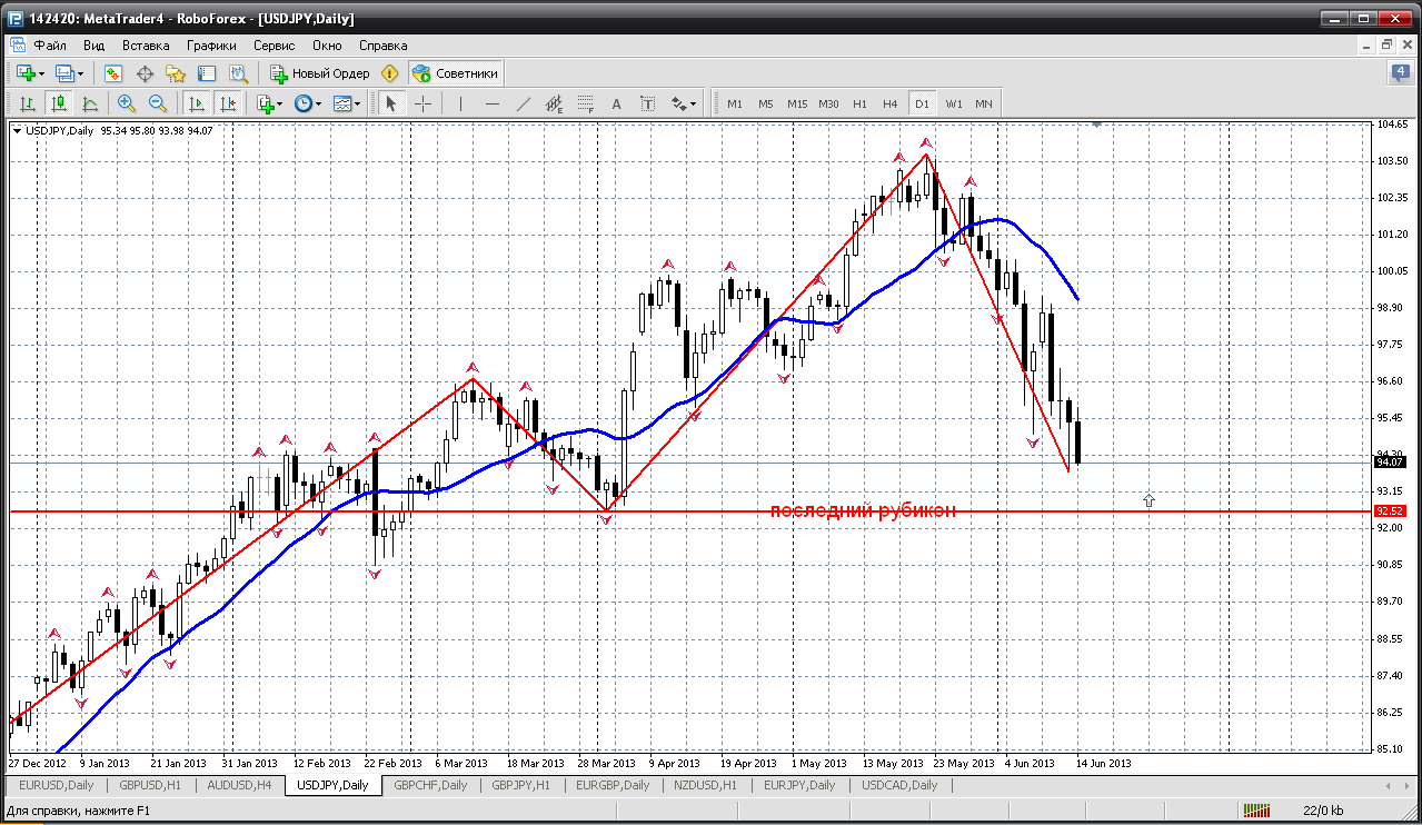 Пара продолжает находится под сильным давлениям медведей которые сосредоточили свои силы в районе скользящих аллигатора, пару все ближе и ближе поджимают к зоне нижних фракталов (поддержке 94.00), на этой неделе думаю должны выйти к 93.00 отметке, а пока жду свою точку входа на продажу. |