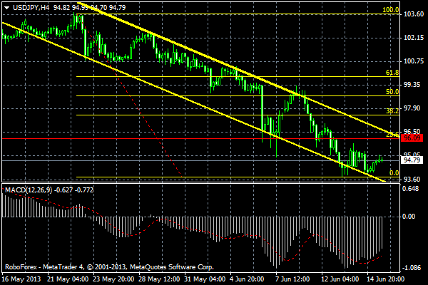 Валютная пара USD/JPY торгуется в рамках нисходящего канала 4-хчасового графика. Прогнозирую рост котировок с текущих уровней к линии сопротивления канала 96,09, что также соответствует уровню 23,6% по Фибоначчи. |