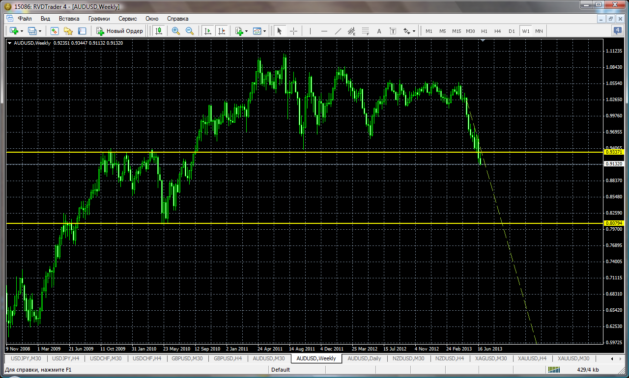 После пробоя минимума 2011 года по инструменту сформировался новый коридор с поддержкой 0,9145-60 и сопротивлением 0,9335.В пятницу цена вышла из диапазона установив новый минимум .Теперь продажи при возврате к 0,9145-60 и покупки после пробоя уровня и его тестировании как поддержки . |