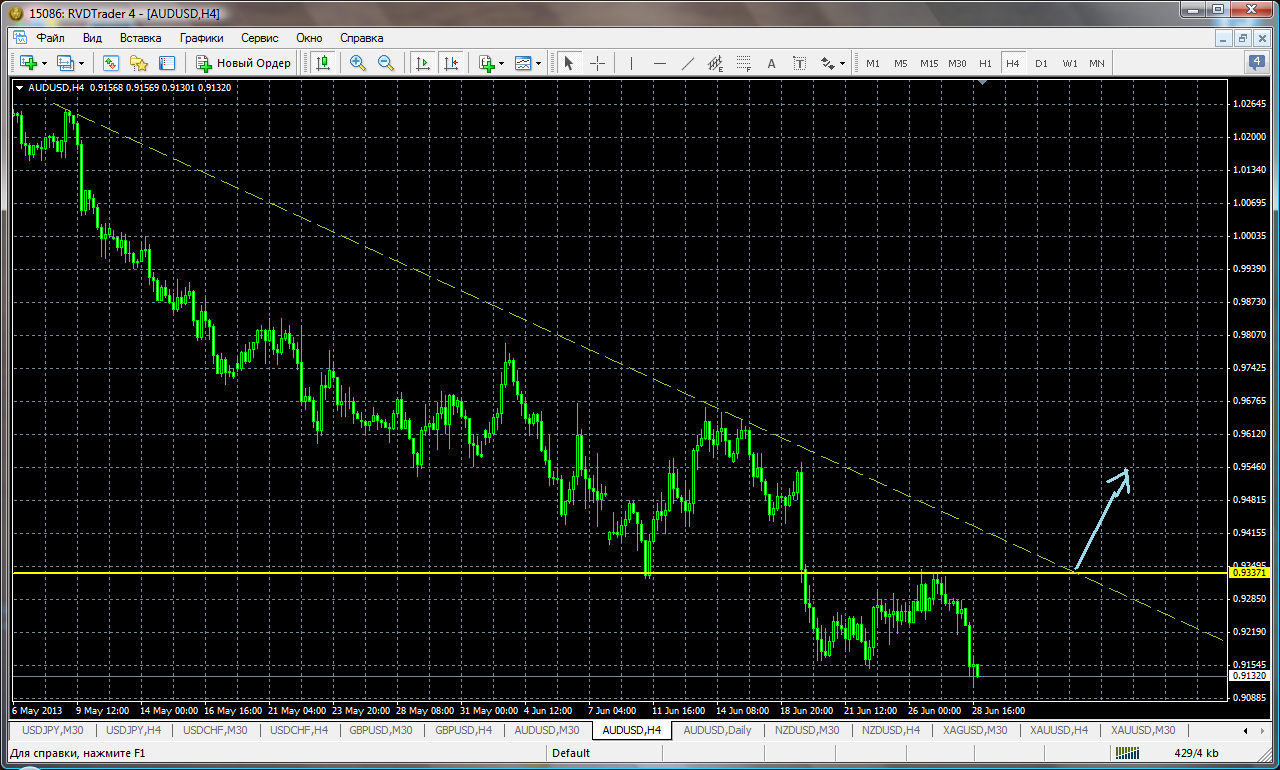 При пробое данного уровня пара пойдет отрабатывать вторую цель 0,9175, после пробоя которой откроется цель нижняя граница нисходящего канала.