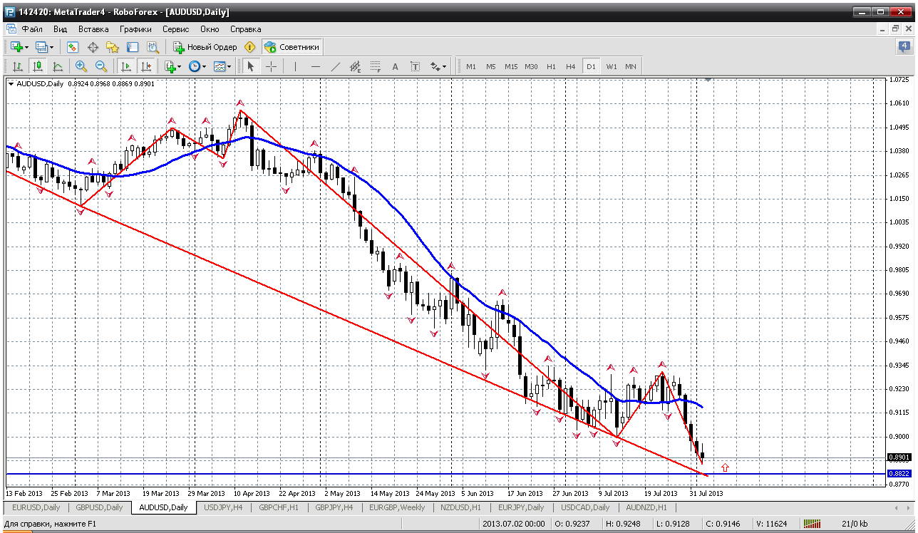 По австралийцу ищу только покупки...ну на таких уровнях, да продавать, что то не хочется. Вчера удалось урвать свои 40 пипс, думаю и дальше от сильных поддержек по чуть чуть брать...так вот покупки на неделе буду делать от уровня 0.8830 (дневной график) и если все нормализуется, то к дневному мувингу цена может и подойдет. А это уже выше 0.90. У меня так получается... Прикрепленные файлы: