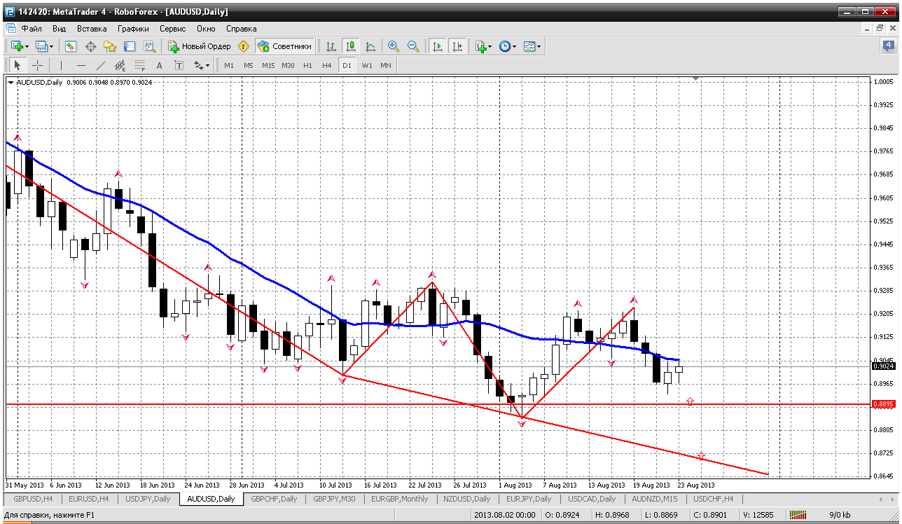 Австралиец доллар закрыл эту неделю с понижением и торгуется под уровнем сопротивления на 0,9040.Отработана цель по фигуре двойная вершина .На понедельник буду смотреть сигналы на продажу по паре при торговле под уровнем сопротивления на 0,9040 и сигналы на покупку при пробое уровня и торговле над ним . Прикрепленные файлы: