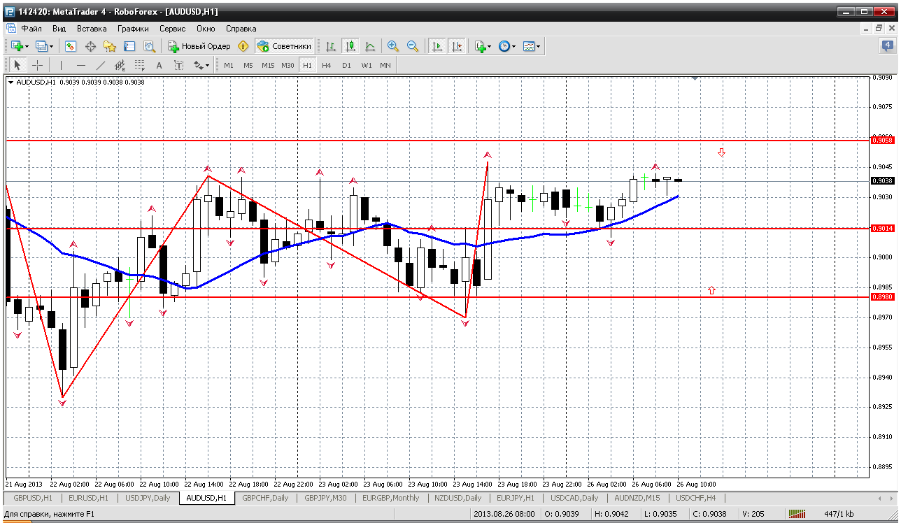 ![]() Пара пробовала расти и даже проколола уровень 0.9020, но в результате на графике появилась разворотная свеча. На завтра ожидаю продолжения роста и в случае пробоя уровня 0.9020 буду покупать. | ||||