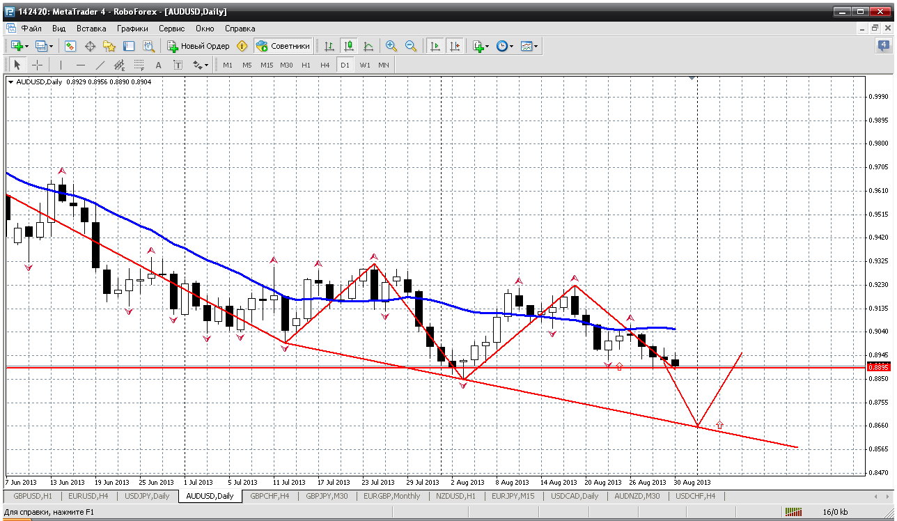 Немного не оправдала пара моих ожиданий на прошедшей неделе пара AUD/USD. Продолжаю держать лимитные ордера в ожидании уже не прелоя, но хоть бы ретеста лоя 0,8850. Хотя в перелое все больше сомневаюсь. Наверное при выходе их канала (серого цвета) откроюсь на покупку по текущей цене а со стопом определюсь по мере развития событий. Цели остаются прежними - 0,93 или выше. Всем удачной охоты! ![]() | ||||