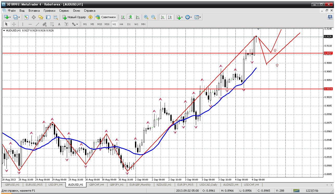 пара показывает на этой неделе рост из за того что инвесторы избегают рисков из за кризиса с Сирией, но все же считаю что пара пойдет на снижение как только в Америке определятся в своих действиях. В данный момент пара торгуется выше нисходящего канала, а ЕМА находятся ниже и показывают некий рост. ЕМА8 используется в качестве короткой поддержки. Сегодня ночью выходит сильная статистика по Австралии по ВВП и она может дать дополнительный импульс к росту пары на пробой уровня 0,9085, но если такое произойдет пара начнет снижаться от уровня 0,9135. но опять же хочется сказать о том что ГЕП так и не был перекрыт. Если пара пойдет выше, то буду фиксировать убытки. ![]() | ||||