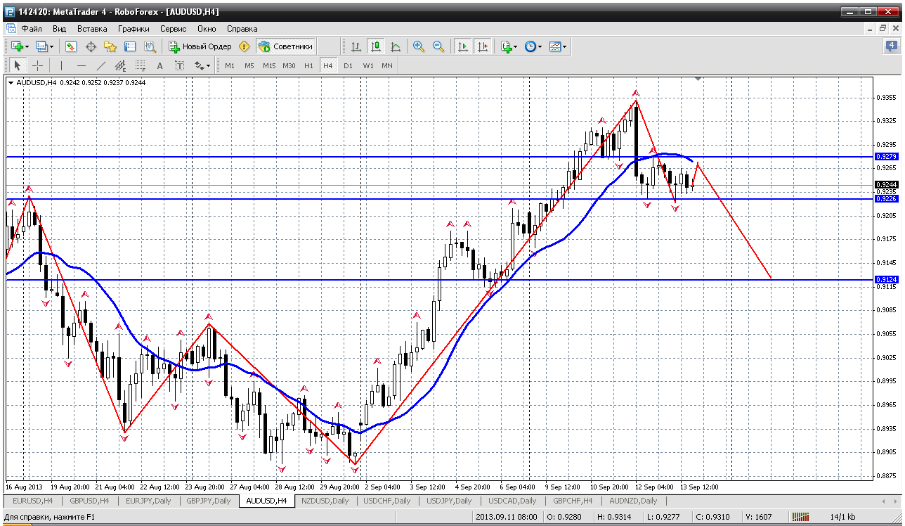 По австралийцу на Н4 предполагаю следующий план действий: мувинг на Н4 уже выгнулся на снижение. Пара уже два дня находится в узком диапазоне 0.9222 - 0.9279. Думаю цена выполнит технический откат к пробитому мувингу (0.9265-0.9270) и оттуда пойдет на снижение. И цель снижения 0.9124 (50% откат последнего роста) Прикрепленные файлы: