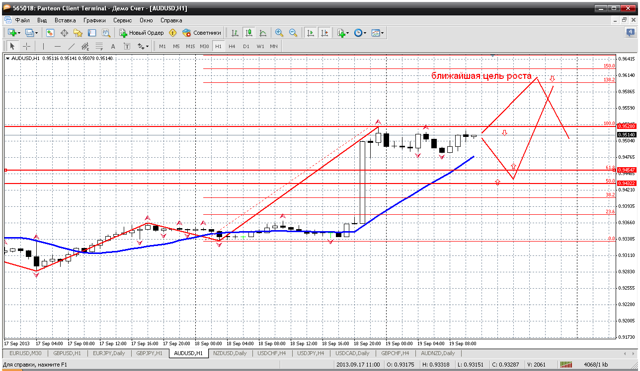 Что по австралийцу после вчерашнего роста? Как и у всех мажоров на сегодня получается одна разметка. Пару можно продать от вчерашнего максимума 0.9528 ,но с небольшим стопом, ведь против тренда идем. А так если прямо с текущих начнется новая волна сильного роста, то ждем 0.9613, там у нас фибо расширение и на дневке и на часовом ТФ (от вчерашнего роста). Вот оттуда продажи более безопасные.