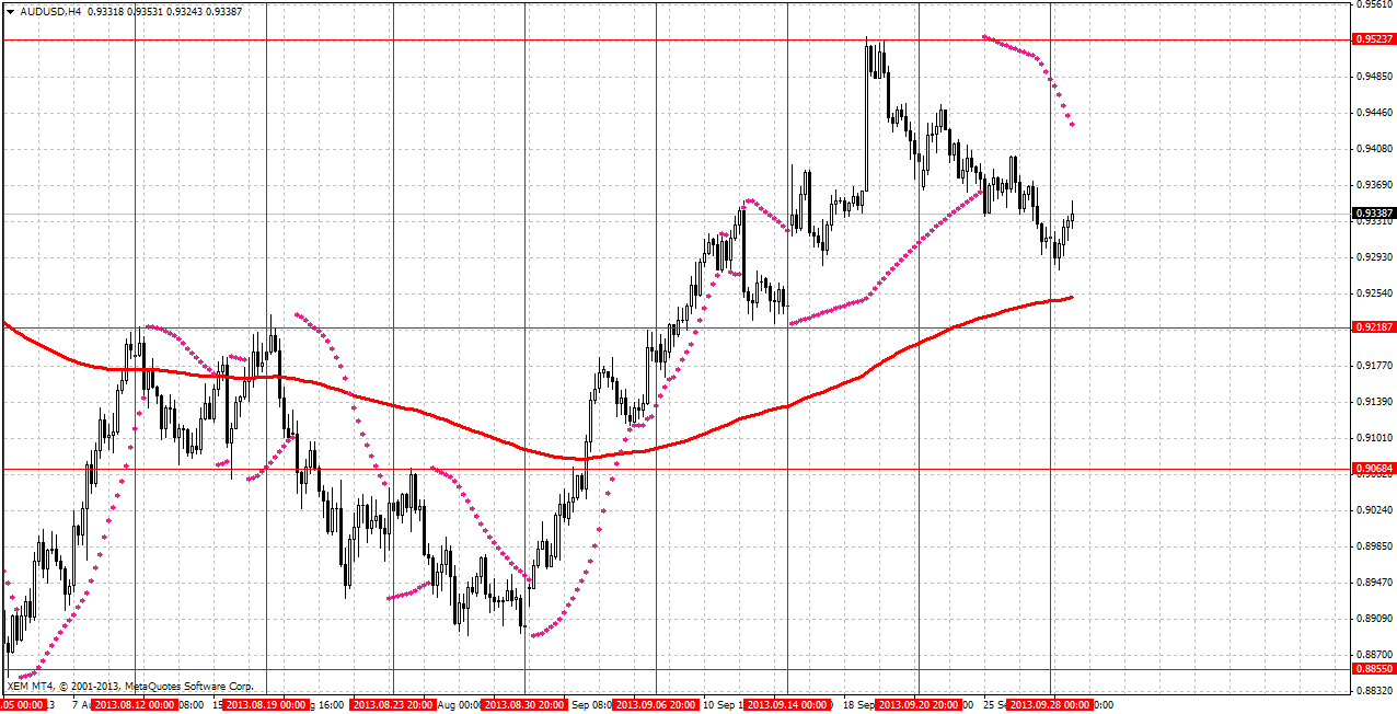 Отбившись от уровня поддержки 0.9280 цена валютной пары австралийский доллар - американский доллар отскочила вверх и даже пробила по ходу своего движения МАшку с периодом 50. На часовом таймфрейме индикатор Боллинджер Бандс начинает разворачиватся наверх, однако учитывая довольно сильный нисходящий тренд позволяет подозревать в этом движении всего лишь коррекционный откат.
