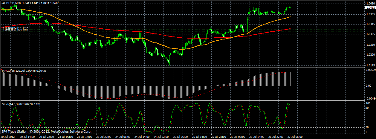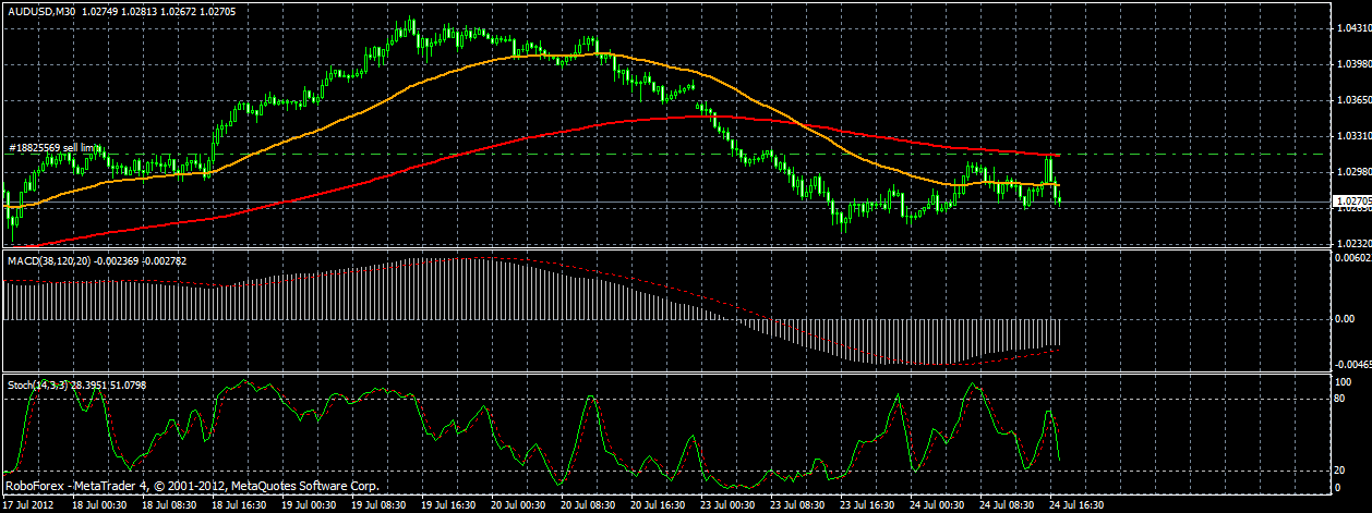 На фоне снижения котировок нефти на торгах в понедельник вся секция товарных валют испытывает давление и общая тенденция вниз преобладает на всех торговых парах.Не исключением явилась и пара aud\usd.При возможном отскоке к линии сопротивления 200МА установлен лимитный ордер на продажу.