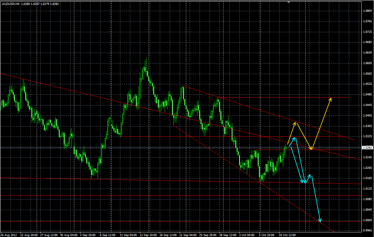 По паре рассматриваю два варианта развития событий. На скриншоте выделил желтым и голубым.Первый - разворотный: возможен подъем к уровню 1,0380-1,0390, коррекция на 1,0280 и уход вверх на 1,0480. Второй вариант, небольшой подъем к уровню 1,0325, затем спуск к поддержке 1,0150, небольшая коррекция и продолжение снижения к психологическому уровню паритета на 1,0000. Прикрепленные файлы: