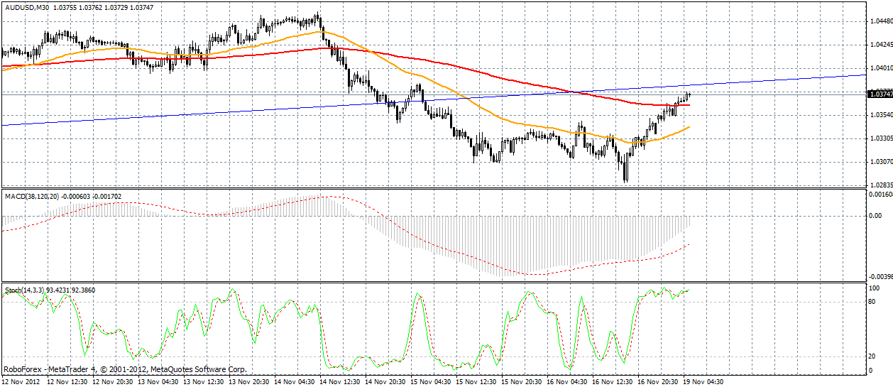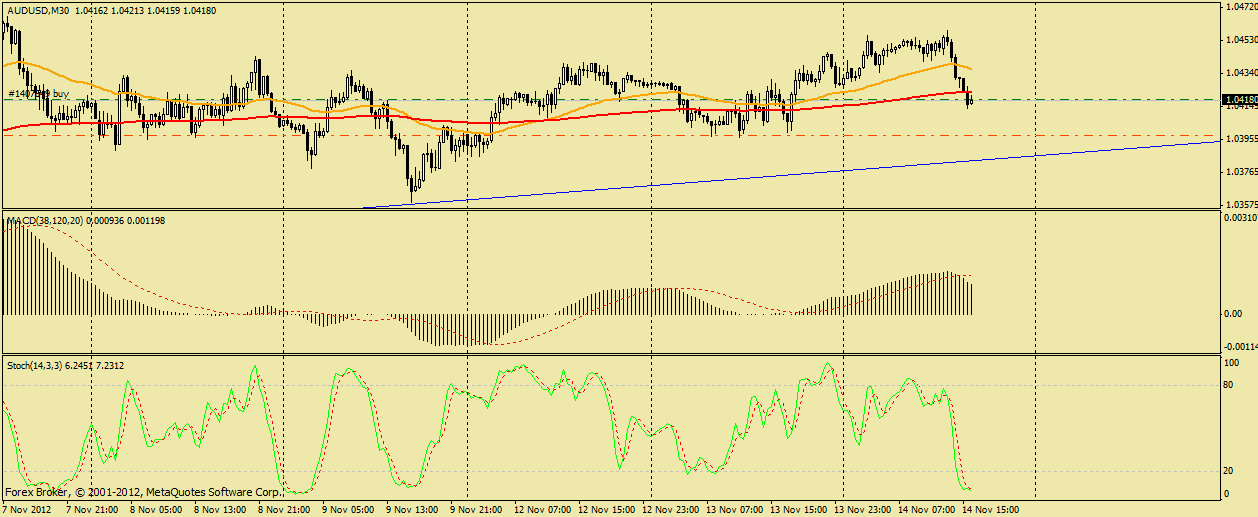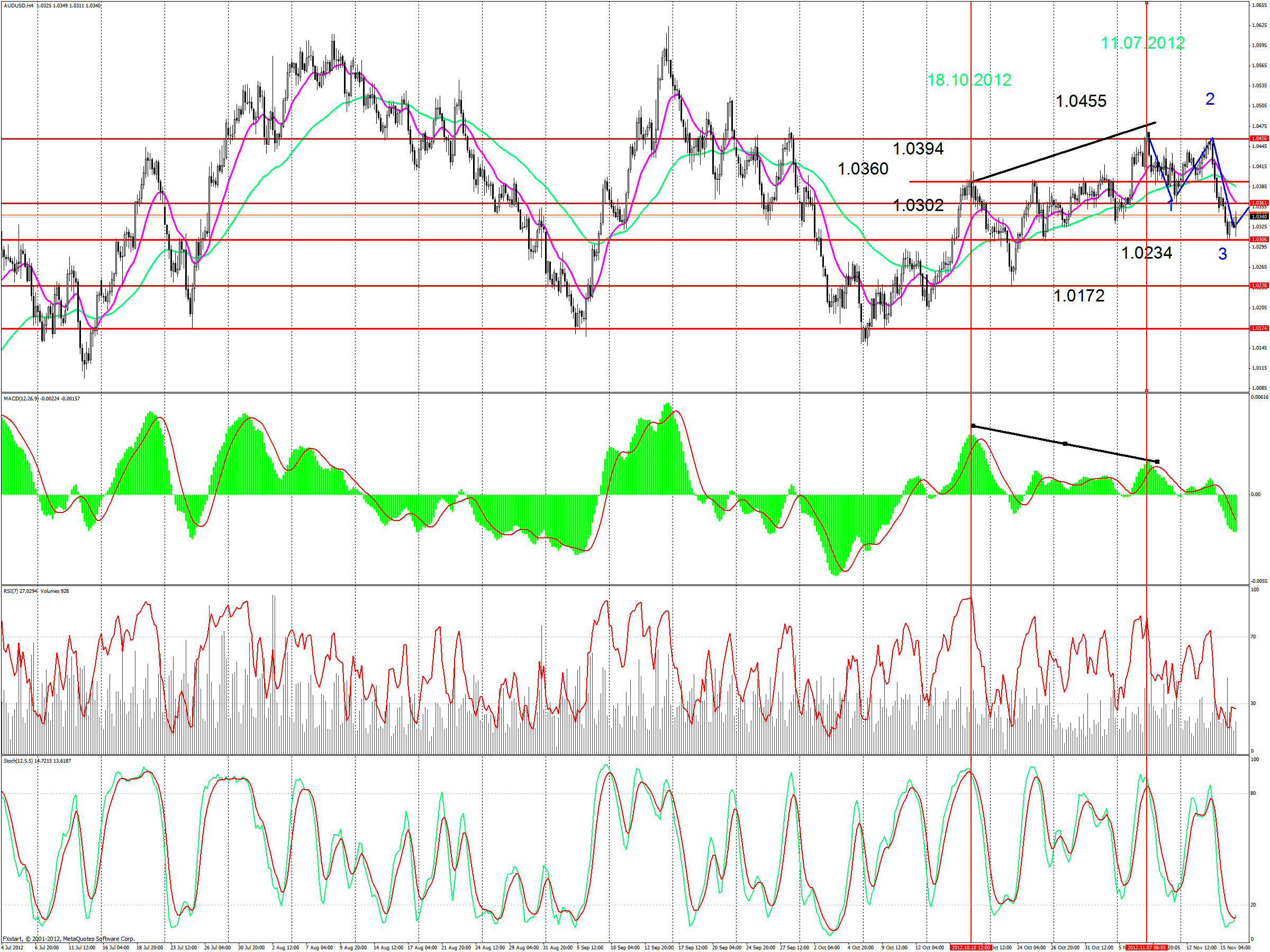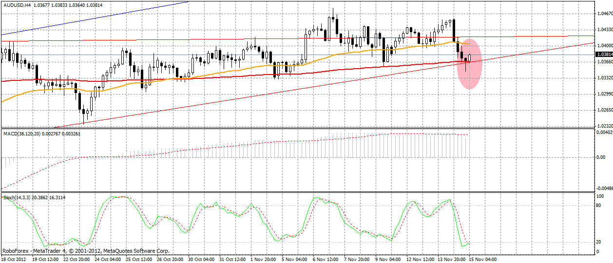 Как я вчера и писала произошел отбой от наклонного уровня (дневной график), пока остается еще преодолеть синею скользящею аллигатора (поддержка 0330), если произойдет пробой его -это станет первым признаком смены среднесрочного тренда. ![]() Я думаю, что падение австралийского доллара уже себя исчерпывает, и стоит ожидать северную коррекцию хотя бы до ценового уровня 1,0365. | ||||||||||
