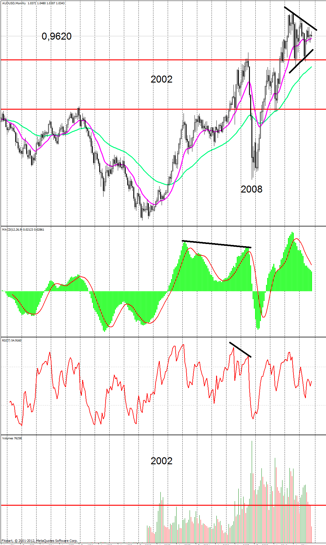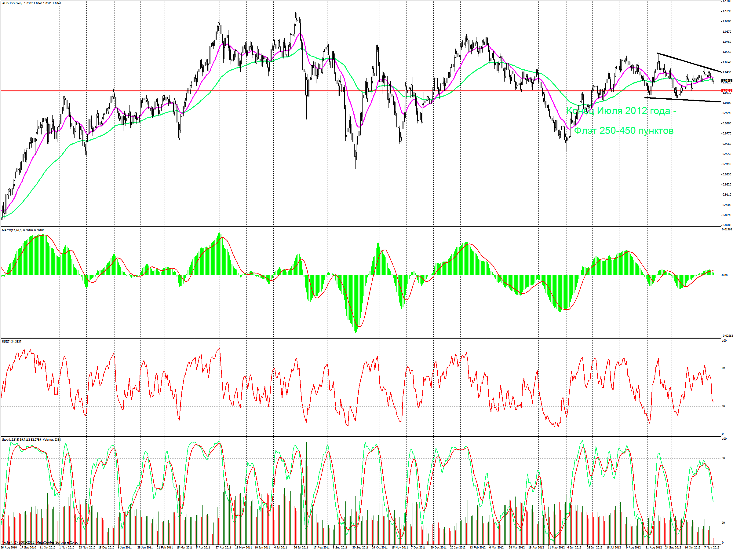 Месячный тайм фрейм.Рассмотрим индикатор объема Volumes. Согласно индикатору, очевидно, что инвесторы не рискуют часто работать с данной парой, в отличие от пред- и посткризисной ситуации 2008 года. Интерес к паре стал уменьшаться с июля 2012 года. В настоящий момент тиковое обращение к паре меньше, чем это наблюдалось в 2002 (в течении четырех месяцев) и с 2007 года. Объясняем это низкой волатильностью пары, по сравнению с указанными годами. Учитывая движение цены в сужающемся треугольнике и противоречивые сигналы от МА – Bay; МАСD – Sell; RSI – флэт, рекомендуем ЖДАТЬ повышение волатильности, после чего входить в рынок. Для тех кто не может ждать – осторожно (малыми объемами) ПРОДОВАТЬ до уровня 0,9620. Вывод основан на осцилляторе MACD дающий долгосрочный сигнал, в данном случае – Sell. Также вывод о Sell сделан из-за того, что цена находится вверху канала.Недельный тайм фрейм.Индикаторы скользящей средней двухнедельный (розовый) и двухмесячный (зеленый) переплетаются, что говорит о флэтовом движение. Также флэтовое движение можно наблюдать на Stoch (12,5,5), RSI (7) и MACD (12,26,9). Рекомендация – ЖДАТЬ повышения волатильности.Дневной тайм фрейм.Флэтовое движение с июля данного года, поэтому справедливо применить индикатор Stoch., который показывает сигнал на продажу (главная линия пересекает сигнальную). Однако сигнал слабый так как сформирован не в зоне перепроданности (в области 70-75 значений Stoch, что меньше 80 – стандартной зоны перекупленности МТ4) Текущая цена, на момент написания 1.0319. показывает острожные ПРОДАЖИ до уровня 1,0234 (ожидаем профит 85 пунктов).Тайм фрейм Н4.Работая с Н4 видим отработку дивергенции (бычьего расхождения). Принимая во внимание, что кол-во тиковых обращений, при «возникновении» дивергенции (в момент максимума цены 18.10.2012) до момента её «окончания» (максимум цены 11.07.2012) существенно меньше периода от 11.07.2012 до сегодняшнего дня. Иначе можно сказать, что суммарный объем площади, очерченной главной линией MACD расположенной в положительной зоне меньше, чем площадь, очерченная главной линией расположенная в отрицательной зоне MACD. Из выше сказанного, предполагаем, что дивергенция не отработана. Поэтому ожидаем снижение цены до следующих уровней сопротивления: 1.0234, 1.0172. Учитывая волновое движение цены (показано синим цветом), считаем, что первая волна сформировалась на отметке 1.0360, затем цена вернулась на прежние позиции (образовалась вторая волна), откуда образовалась третья волна и, в настоящий момент времени, находится на отметке 1,0302. Рассматривая ближайший «сценарий движения цены», логично предположить отработку осциллятора недельного RSI и Stoch (12,5,5) - формирование четвертой волны до уровня 1,0360 и 1,0394. Тем не менее, на старшем дневном тайм фрейме, цена перекуплена и двигается «вниз» , поэтому не исключена возможность продолжение третьей волны до уровня 1,0234 и 1,0172. Таким образом, делаем вывод, что вероятность цены двигаться вниз больше, чем вверх. Поэтому рекомендации ПРОДОВАТЬ до уровня 1,0234 и 1.0172, откуда рекомендуем покупать до отметок 1,0234 и тек. отметки 1,0334.Месячный тайм фрейм.![]() Недельный тайм фрейм.![]() Дневной тайм фрейм.![]() Тайм фрейм Н4.![]() Прикрепленные файлы: