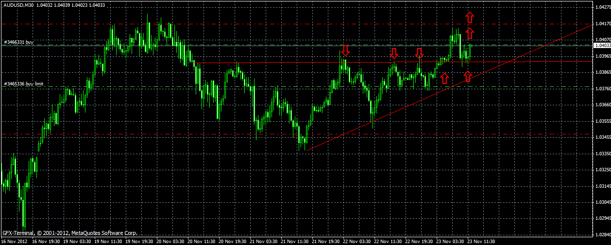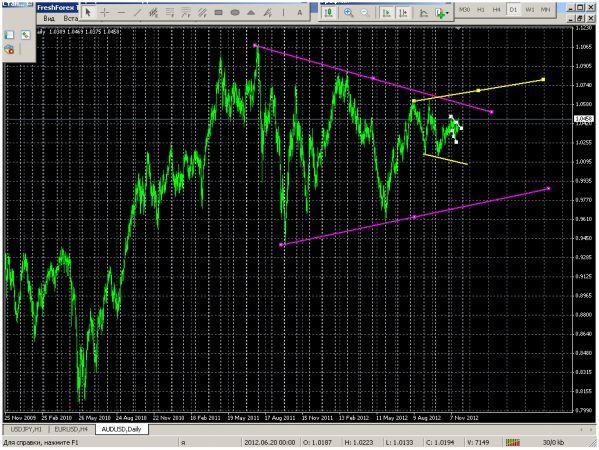 Очень сильный сигнал, три в одном, три фигуры продолжения на одной паре, на разных таймфремах, что то похожее на три экрана Эльдера, все, крупные средние и мелкие игроки рынка сошлись во мнении, что нужно покупать австралийца против доллара США. Как раз то, что наблюдается на других парах, евро, и франку и фунту, но, исключение Японская Йена. Редактировалось: 1 раз (Последний: 25 ноября 2012 в 11:43) алексастра |