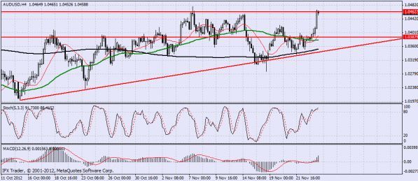 австралиец пробил последнее сопротивление 1,04 и отработал в район 1,0470. если сопротивление 1,047 будет пробито и пара продолжит рост, то можно ожидать её в районе 1,053. Если же сопротивление пробито не будет то возврат к 1,04