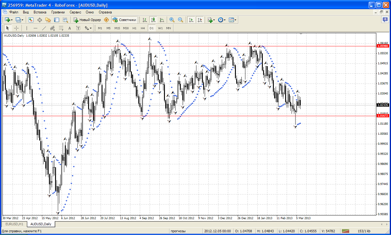 Возможно на часовот таймфере образовалась разворотная графическая фигура "двойная вершина" и движение вниз может начаться в любой момент.Отрисовка правой вершины ,фактически. в стадии формирования и по её окончанию пара должна снизиться в район последнего лоу отм.1.02155 Прикрепленные файлы: