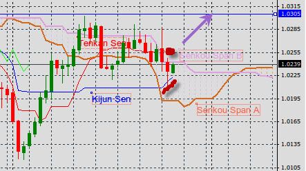Цена находится между линиями Kijun Sen и Tenkan Sen,а так же внутри облако индикатора Ишимоку.Исходя из этого рекомендую при выходе цены за линию Tenkan Sen открыть ордер на покупку с профитом до уровня 1,0305.Стоп лосс рекомендую поставить на уровне линии Kijun Sen и тралит его по это линии.