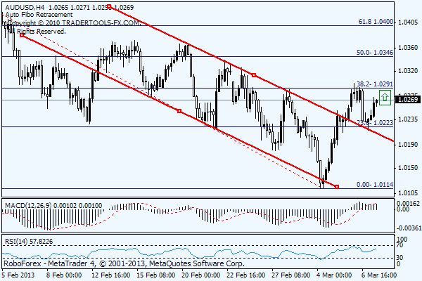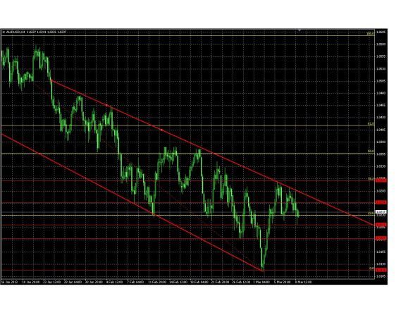 Доброго времени суток. Учитывая что цена пробила низходящий канал в северном направлении я считаю что низходящий тренд по паре AUDUSD сломлен. Пара совершив отскок от пробитой линии канала направилась в северном направлении. Ожидаю дальнейший рост пары к уровню 1.0291(38.2 Фибоначи) где закрою ордера на покупку. В случае пробития уровня 1.0291 рост пары продолжиться к уровню 1.0346. Профитной торговли.
