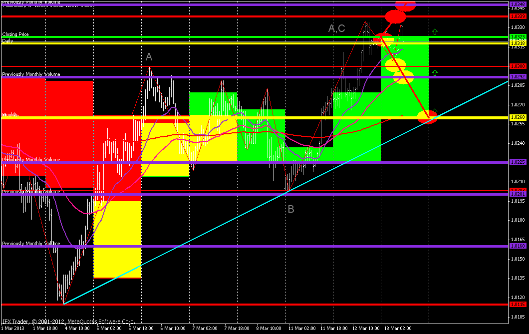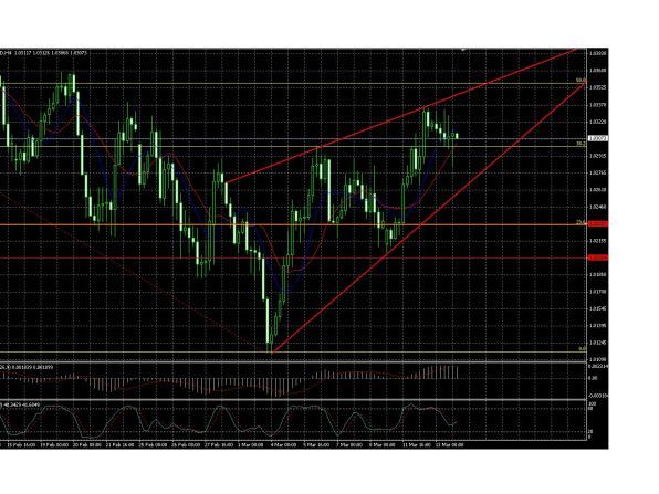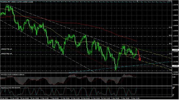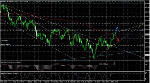 Пробив поддержку канала пара серьезно нацелилась на изменение нисходящей тенденции,но вот удастся ли ей переломить медвежий тренд у меня вызывает большое сомнение.Достигнув отметки 1.03330 пара остановилась натолкнувшись на сопротивление 200МА 4-х часового ТФ. Считаю,что это был критический рубеж и пара дальше не пойдет.