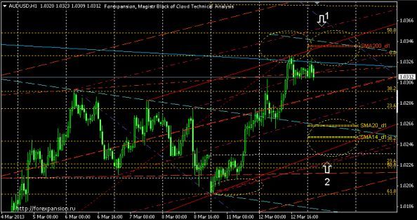 - восходящим уровнем сопротивления по максимумам 7 - 12 марта - нисходящим уровнем сопротивления по максимумам 15 - 20 февраля - 50% уровнем коррекции Фибоначчи от снижения 10 января - 4 марта - двухсотдневной скользящей средней - двумя линиями реакции (рис.1,поз.1) Облако поддержки образовано: - восходящим уровнем поддержки по минимумам 4 - 11 марта - уровнем от экстремумов 8 и 11 марта - ранее пробитым динамическим уровнем - 38% уровнем коррекции Фибоначчи от роста 4 - 12 марта - 50% уровнем коррекции Фибоначчи от роста 11 - 12 марта - скользящими средними SMA14_d1 SMA20_d1 (рис.1,поз.2) ![]() Рисунок 1. График курса aud / usd, h1 | ||||