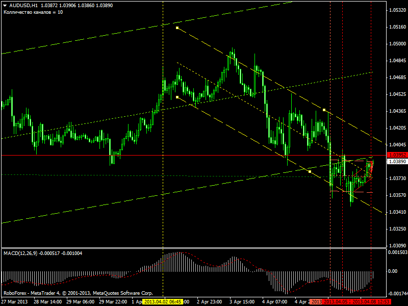 Пара движется в нисходящем канале на таймфрейме Н1. Предполагаю подъем цены до уровня 1,0395-1,0400, а затем - снижение и движение вниз по каналу с целью 1,0320 как минимум. Прикрепленные файлы: