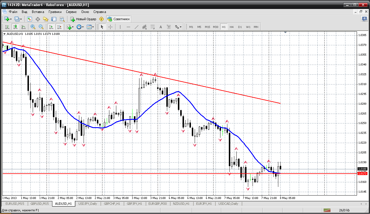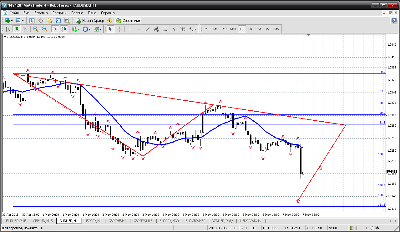 На часовом графике, после непродолжительного восходящего движения цена австралийского доллара наткнувшись на 23.6 уровень Фибоначчи отскочила вниз. Учитывая преобладание нисходящей тенденции в последнее время думаю, что цена снова пойдёт вниз, а сейчас самое время продавать с целью 1.0150. | ||||