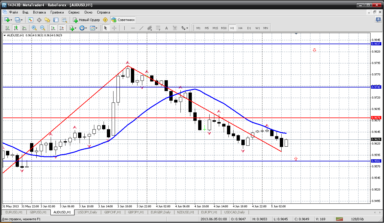 Прогноз AUD/USD на 5 июня 2013г.: ![]() До тех пор пока цена находится выше уровня 0.9582, она должна будет протестировать уровень 0.9677 | ||||