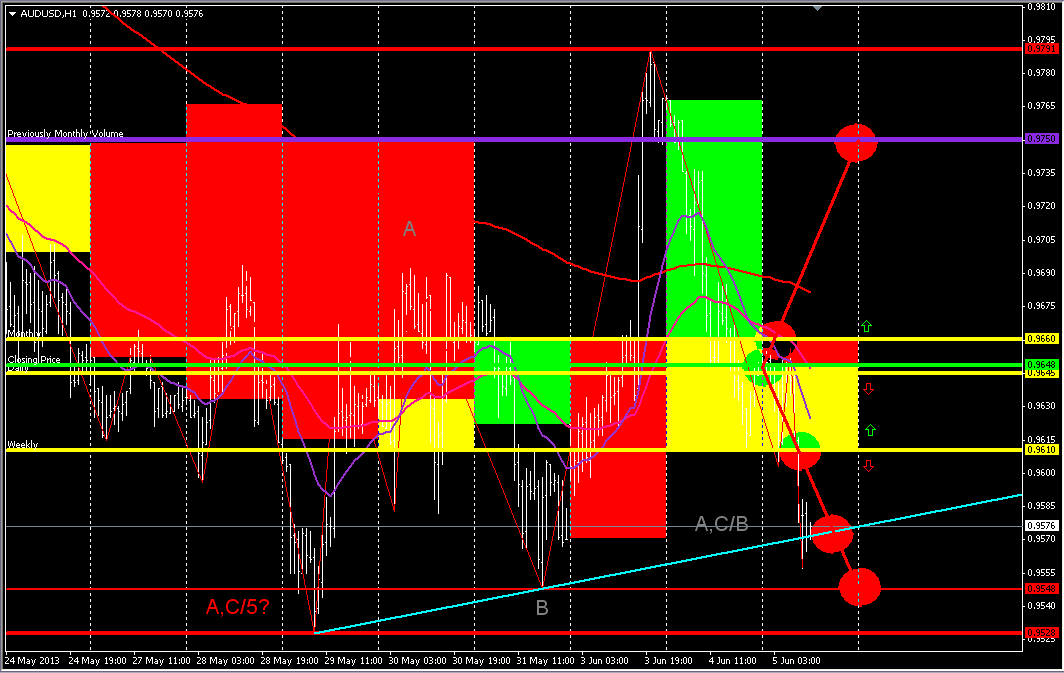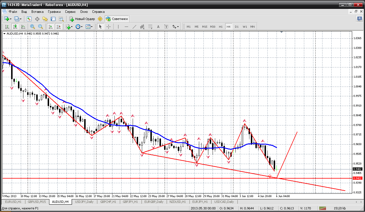 Прогноз AUD/USD на 6 июня 2013г.: ![]() Пара должна закончить снижающее движение в районе 0.9422, после чего она должна подняться к уровням 0.9482 или 0.9569 | ||||