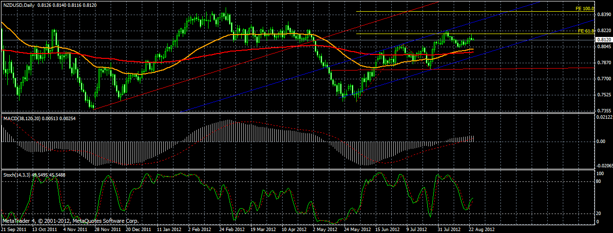 Пара движется в середине растущего канала.Протестировав уровень 61.8 цена отскочила и взяла курс на "юг" .Цель :Сопротивление канала (отм.79.50) Движению вниз препятствуют сильные сопротивления мувингов 50(отм.0.8106) и 200МА(отм.0.8050).