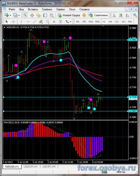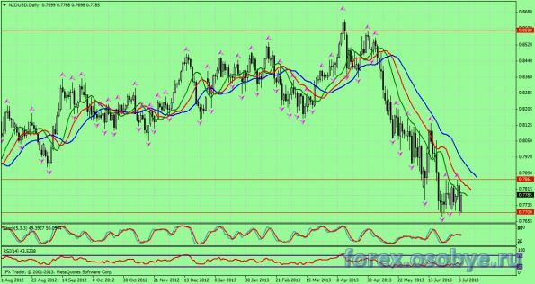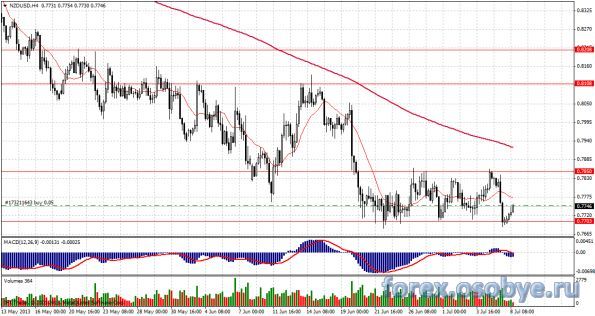 На данный момент по паре NZDUSD торговля ведется ниже скользящих средних линий индикатор ниже нулевой линии с направлением вверх а главный индикатор на пять бар дает сигнал на покупку рекомендую покупать при пробитии линии 0.7726 до линии сопротивления 0.7841 стоп лосс установить у линии поддержки 0.7697.