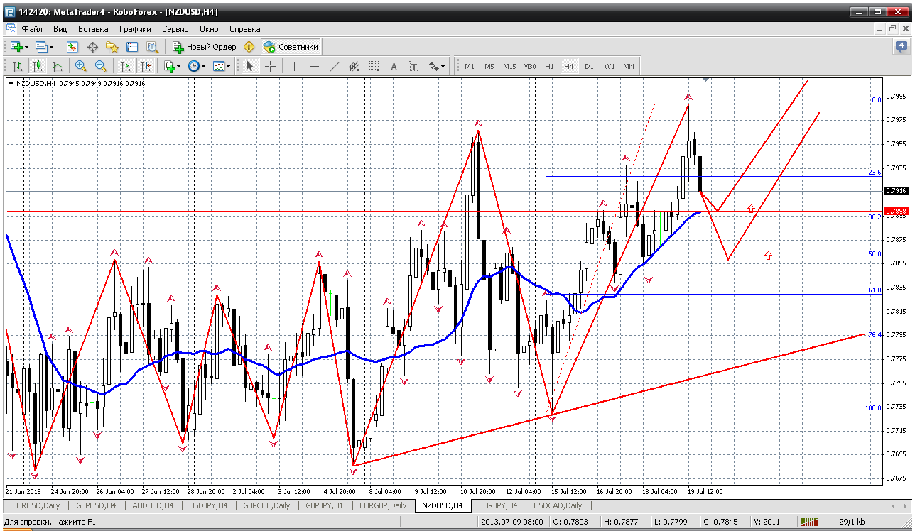 Новозеландец, если глянуть на график Н4, уверенно растущий. "Оседлал" мувинг и движется на север. На неделе ожидаю откат до 0.7898 (мувинг) и в рост. Максимум отката - это уровень 0.7860 (50% -ый откат по фибо на последнем росте). А в целом тест уровня 0.80 вполне реален. Прикрепленные файлы: