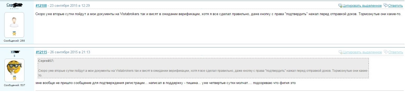 И так можно найти ещё кучу сообщений в одном стиле Дальше будут скорее всего сообщения в духе: "Vistabrokers не платит прибыль трейдерам", а еще дальше на главной странице сайта: "Vistabrokers - всё, скам" Круто вы работаете ребятки, с такой конкуренцией на рынке, такое халатное отношение к клиентам. Прикрепленные файлы:
